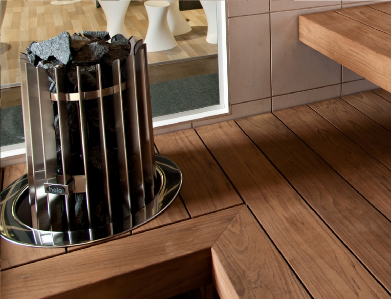 Namhafte Hersteller erzielen mit dem Einsatz von Thermo-Erle interessante Farbkontraste beim Saunabau.